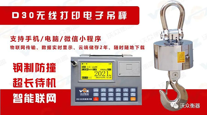 VOZ-D30系列電子吊秤量程:3t~100t(注:高噸位需要定制),性能指標(biāo)符合國(guó)際OIML 級(jí)秤標(biāo)準(zhǔn),適用于冶金、鐵路、倉(cāng)儲(chǔ)、港口、工礦企業(yè)等各種計(jì)量場(chǎng)合。